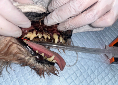 歯冠部全体を覆うように歯石が付着し、歯肉の重度腫脹や後退が認められた。